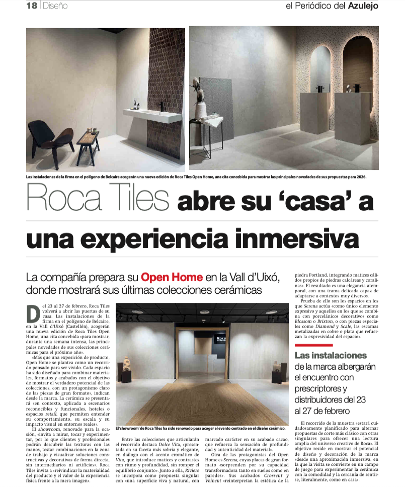 Del 23 al 27 de febrero de 2026, Roca Tiles volverá a abrir las puertas de su casa. Las instalaciones de la firma en el polígono de Belcaire, en la Vall d’Uixó, acogerán una nueva edición de Roca Tiles Open Home, una cita concebida para mostrar, durante una semana intensa, las principales novedades de sus colecciones para el próximo año.