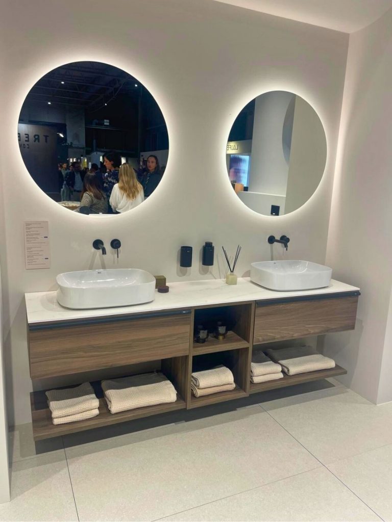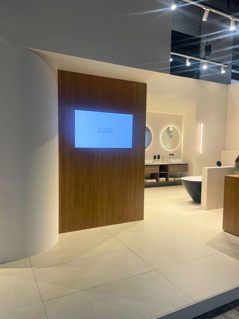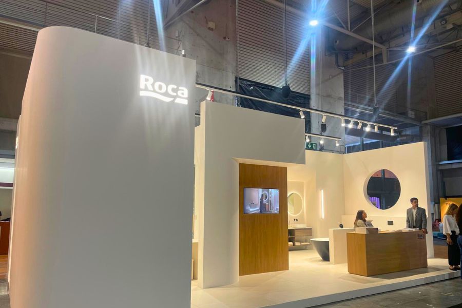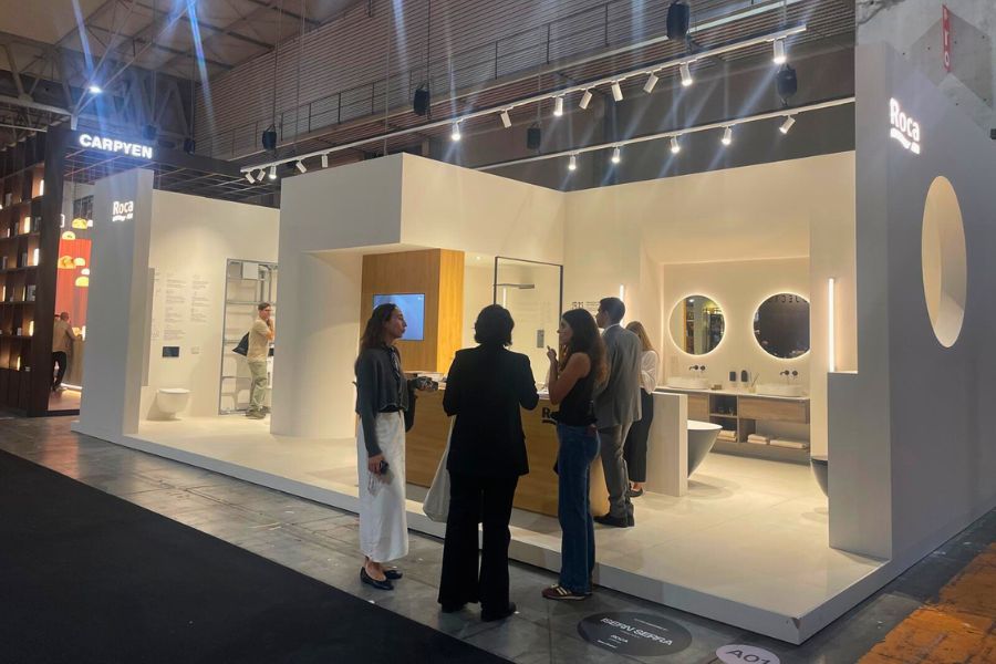 El diseño del stand permitió apreciar la integración de las superficies cerámicas de Roca Tiles con las soluciones de baño de Roca, mostrando una propuesta de diseño de espacios sostenibles y estéticamente coherentes.